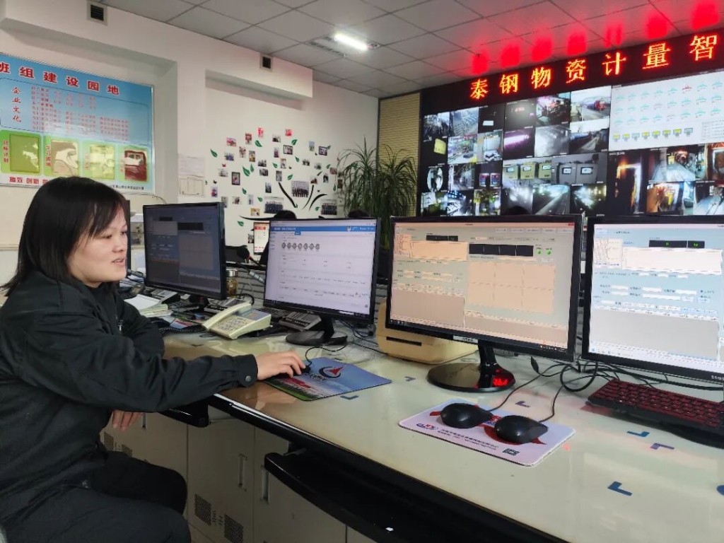 在自动化部物资计量监控中心,屏幕上跳动着实时数据与监控画面,作业长亓萌正专注地操作系统,为一车进厂物资进行计量。
