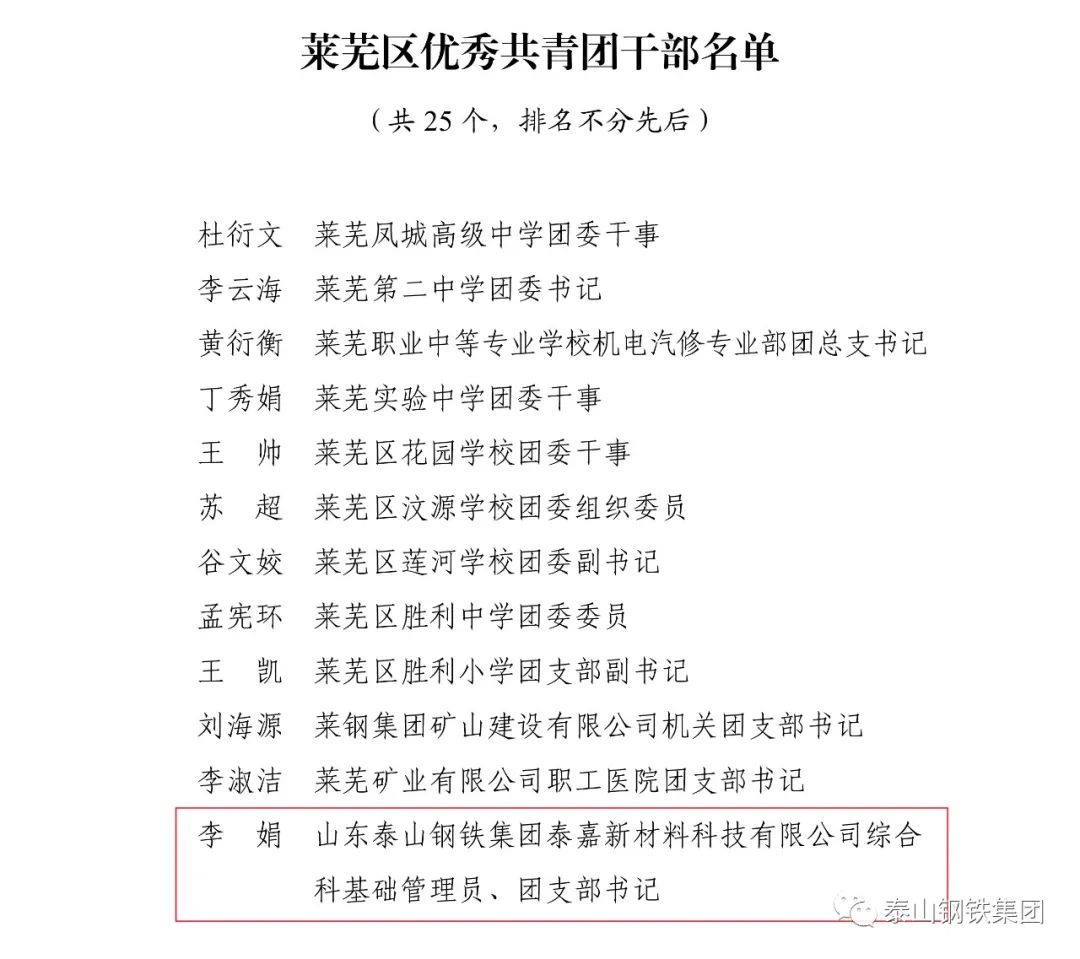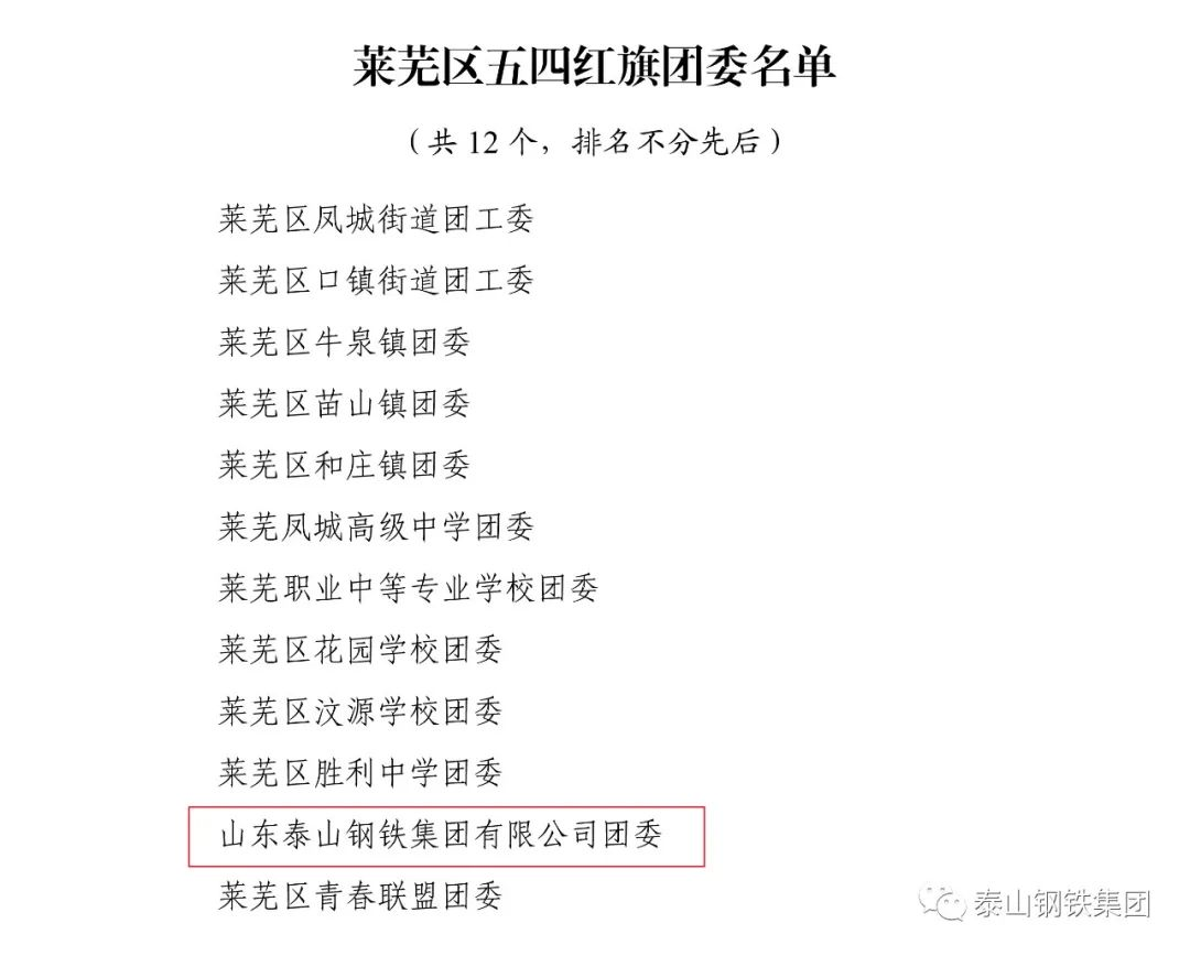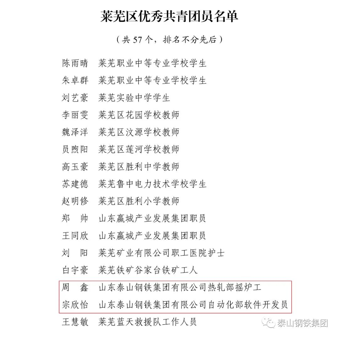 近日,共青团济南市莱芜区委下发文件《关于2022年度莱芜区五四典型的表扬通报》,表彰了一批先进单位和个人。其中,泰山钢铁集团团委上榜“莱芜区五四红旗团委”名单,泰嘉新材料团支部上榜“莱芜区五四红旗团(总)支部名单”,职工周鑫、宗欣怡上榜“莱芜区优秀共青团员名单”,职工李娟上榜“莱芜区优秀共青团干部名单”,职工亓敬坤、刘兆国被评为“莱芜区青年志愿者优秀个人”,雷火(中国)青年志愿者服务队“打造幸福城市,送温暖进山村”志愿服务项目被评为“莱芜区青年志愿者优秀项目”。