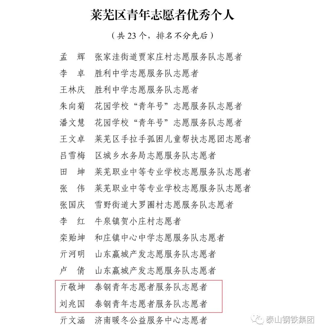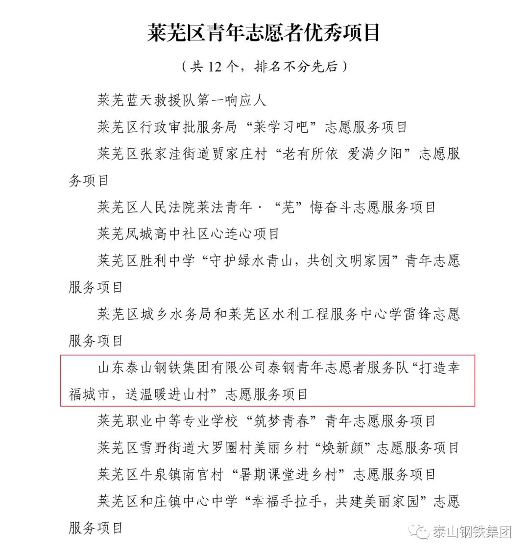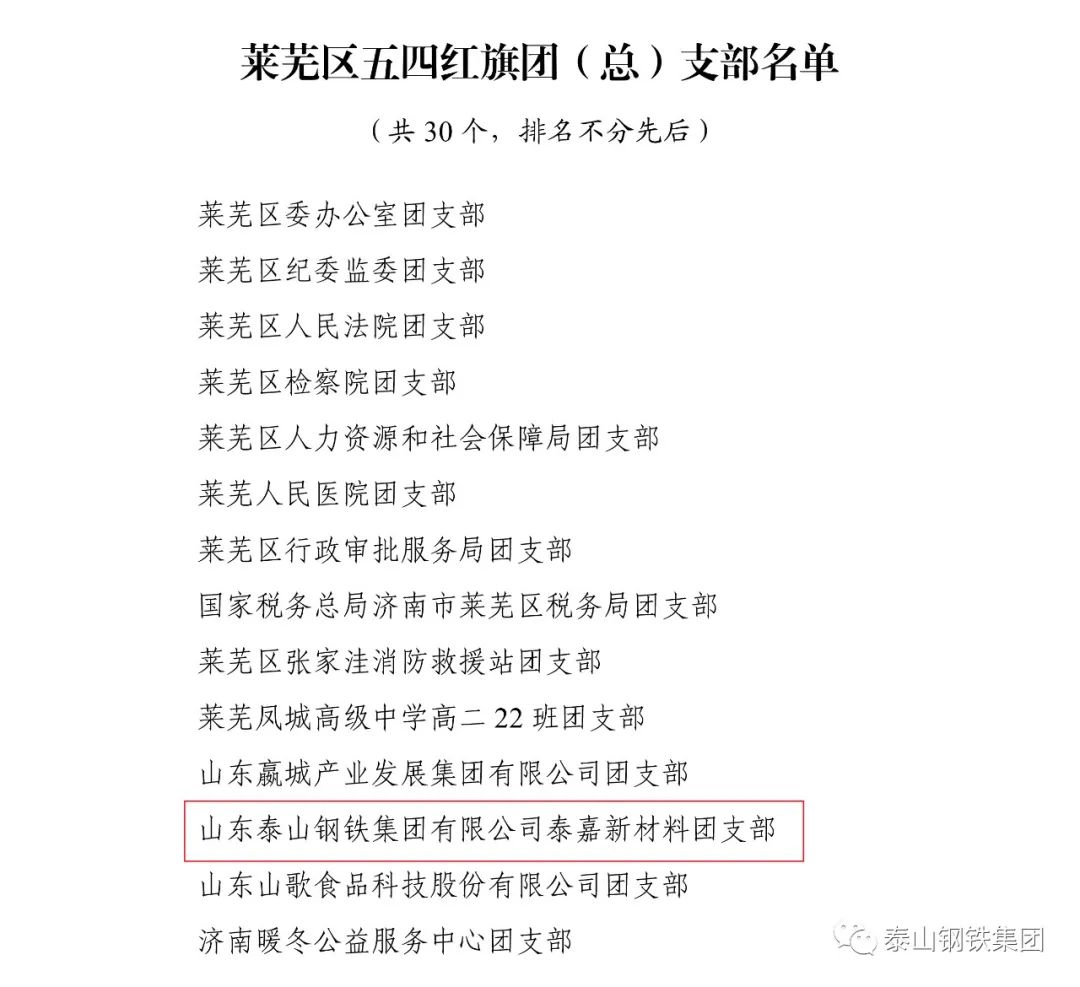 近日,共青团济南市莱芜区委下发文件《关于2022年度莱芜区五四典型的表扬通报》,表彰了一批先进单位和个人。其中,泰山钢铁集团团委上榜“莱芜区五四红旗团委”名单,泰嘉新材料团支部上榜“莱芜区五四红旗团(总)支部名单”,职工周鑫、宗欣怡上榜“莱芜区优秀共青团员名单”,职工李娟上榜“莱芜区优秀共青团干部名单”,职工亓敬坤、刘兆国被评为“莱芜区青年志愿者优秀个人”,雷火(中国)青年志愿者服务队“打造幸福城市,送温暖进山村”志愿服务项目被评为“莱芜区青年志愿者优秀项目”。